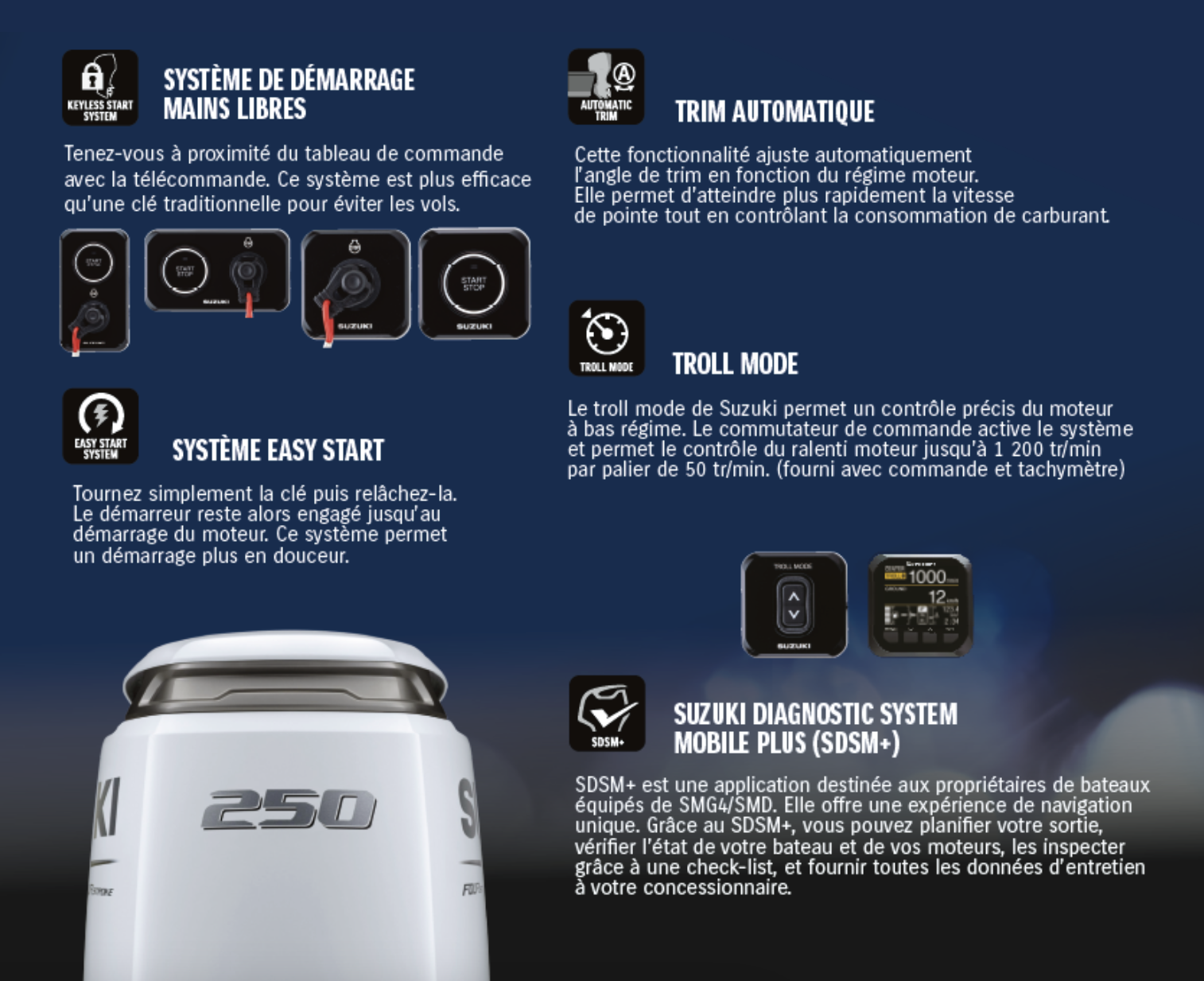 - Le Diagnostic System Mobile Plus : une technologie permettant de consulter en un clin d’œil les données essentielles du moteur avant de prendre la mer.